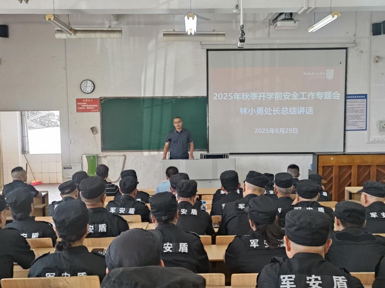 8月29日上午,MG冰球在良材楼101室召2025年秋季开学安全工作专题会,安全保卫处全体人员、学生工作处相关人员、消防维保公司相关人员、福建省军安盾保安服务有限公司负责人及全体安保队员参会。