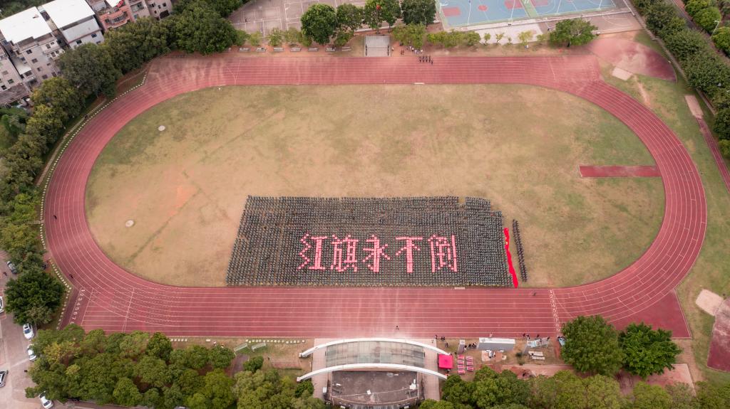 全场一起唱响《歌唱祖国》,军训列阵举行国旗传续仪式,队列摆出“红旗永不倒”文字,会操圆满落幕。