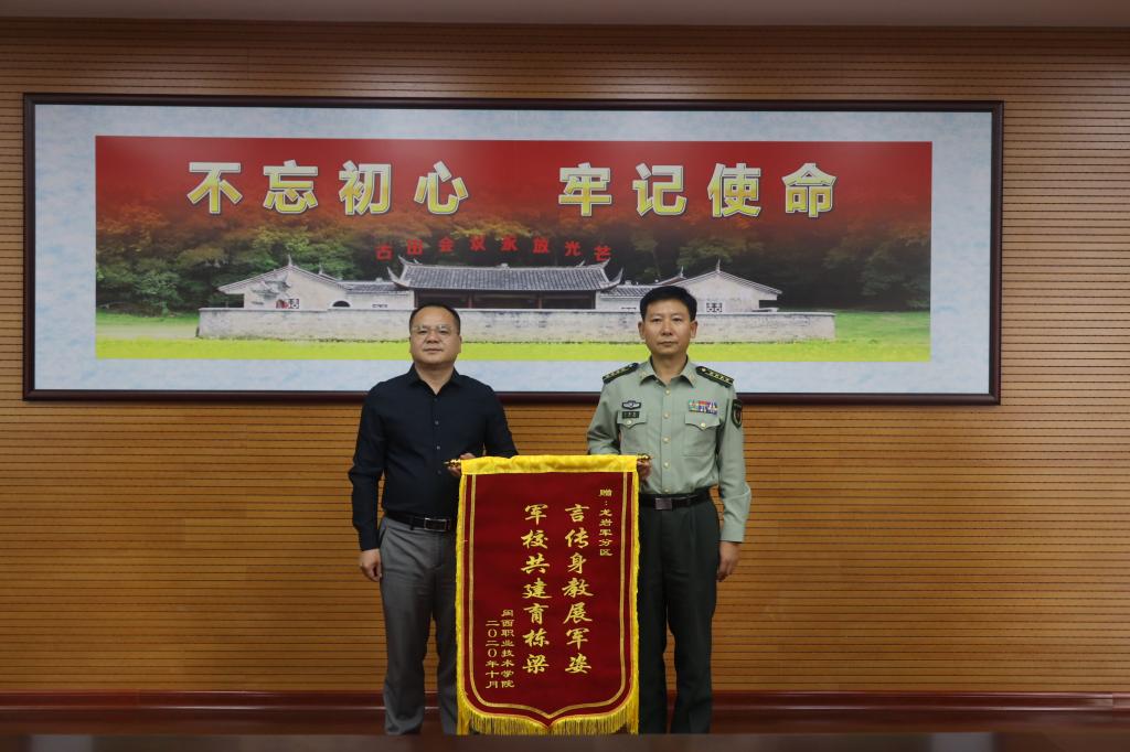 2020级新生军训圆满完成,为感谢龙岩军分区的大力支持,学院向龙岩军分区政送上“言传身教展军姿 军校共建育栋梁”的锦旗。龙岩军分区政委石海东代表军分区接受了锦旗,并与学院领导座谈军校共建相关事宜。