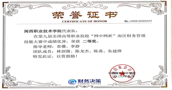 2020年11月28日,由中国高等教育学会高等财经教育分会指导、中国商业会计学会主办的第九届全国高等职业院校“网中网杯”财务管理决策大赛,全国177所高职院校,经过校内赛、全国初赛的层层选拔,脱颖而出的全国52支队伍进入总决赛。我院参赛选手来自18级会计专业的林剑微、陈龙杰、陈禹、朱建烨这四位同学。指导老师为章珊、李静。经过管理会计和财务决策两轮比赛的激烈角逐,历时一天的全国总决赛圆满落幕。最终我院代表队以全国第19名的成绩喜获全国二等奖。