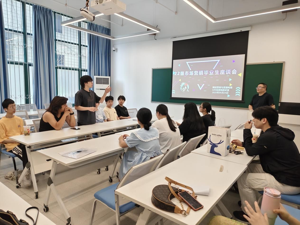 2025年6月24日上午,财经商贸学院网络营销与直播电商专业在万源楼抖音实训室C成功举办了一场别开生面的座谈会。专业挂钩院领导、教研室老师及2025届毕业生代表参加了本次座谈会。