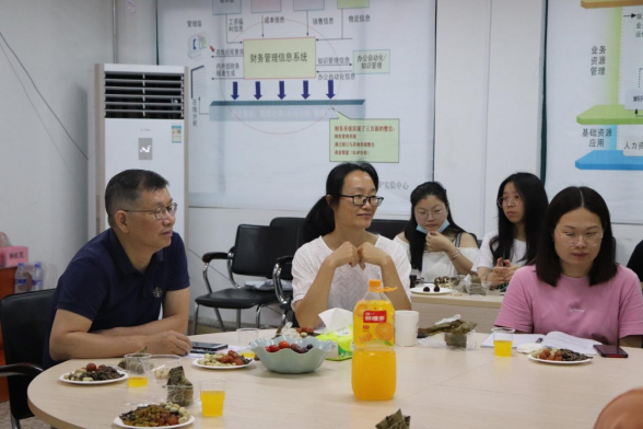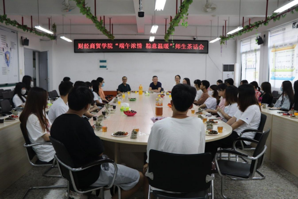 为弘扬中华民族传统文化,营造浓厚的节日氛围,丰富大学生的精神文化生活,加强师生之间的交流联系,促进我院学生对中华传统文化以及传统节日进一步的了解和学习,增强大学生的文化自信、文化认同感,我院于2022年6月3日在实训楼811开展了财经商贸学院“端午浓情 粽意温暖”师生茶话会,参与本次茶话会的有财经商贸学院党委副书记林照兴、副院长张赠富、团委书记钟丽珍、辅导员赖满梅和部分家庭经济困难学生。
