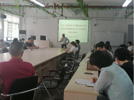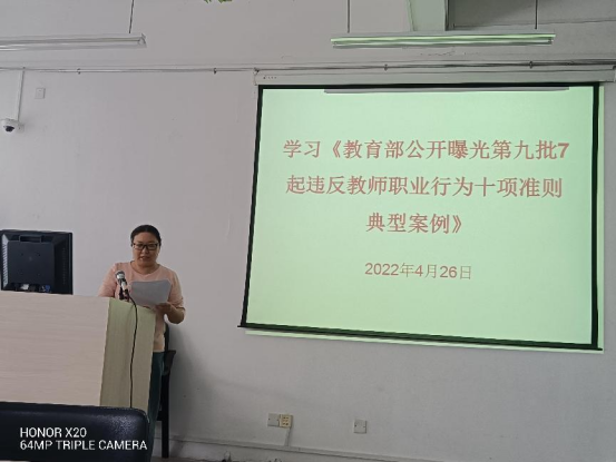 第二阶段党委宣传委员陈静宣读《教育部公开曝光第九批7起违反教师职业行为十项准则典型案例》。财经商贸学院落实学校“师德师风建设年”活动,常态化开展师德师风尤其是警示教育,强化法治和纪律教育,做到警钟长鸣。