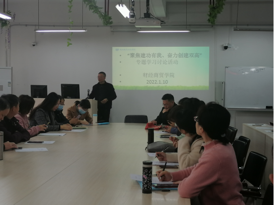 2022年1月10日上午,财经商贸协议在实训大楼811会议室举行“聚焦建功有我、奋力创建双高”的专题学习讨论活动,全体教职工参加了会议安排的集中学习和分组讨论,并提交了教职工“双高计划”项目建设建议意见表。