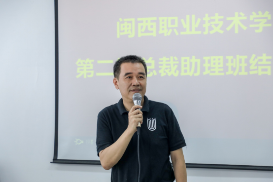 卢伟耀书记首先对33位参加第二期总裁助理班学习并顺利结业的同学表示祝贺,勉励大家以此为起点,努力学习,接续奋斗,将家国情怀融入到学习生活中,不断培育自身的历史责任感与担当意识,书写敢于追梦的奋斗人生。他在讲话中要求大家继续发扬闽西“二十年红旗不倒”的精神,把学校的“团结渠”校园文化内化于心、外化于行,使之成为大家的一种行动自觉,为学校的省双高校建设和高职教育的发展做出应有贡献。
