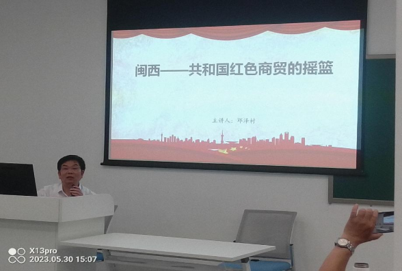 为加强党员教育推进“红色财院”党建品牌创建活动,将党的建设与“树魂、立根、打底色”的教育工作有机融合,全面打造“予生最好学校”,2023年5月30日,财经商贸学院邀请中央苏区(闽西)历史博物馆馆长邓泽村为我院全体教师讲授“闽西--共和国红色商贸的摇篮”为主题的学术讲座。邓泽村馆长长期从事闽西中央苏区的研究,近年来发表学术论文百余篇,主编、参编、出版论著等多部。