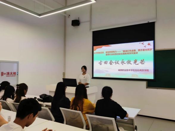 主题教育系列宣讲是财经商贸学院“追寻领袖足迹,感悟思想伟力—“重温红色金融,携手星光筑梦”暑期社会实践活动”中的重要一环,也是打造特色“红色财院”校企合作项目的重要组成部分;在此之前,财经商贸学院暑期社会实践团已经开展了实地访谈调研、文献调研和联学共学环节,在实地调研中实践团参观走访了闽西工农银行旧址、主席园、古田会议会址、古田纪念馆、红色农信诞生地展览馆、共和国法治摇篮展览馆、中央苏区税关史料馆、共和国税收摇篮展览馆、兴业证券古田投教基地等,实地深入学习了解闽西红色金融发展史;在文献调研中,实践团分组翻阅查找了大量典籍、网络文献资料,并结合实地调研访谈情况,撰写了《闽西红色金融资源现状、开发、利用保护情况及存在的问题和对策》调研报告,更加深刻地了解到闽西红色金融为新中国金融事业的发展做出了重要的贡献,是实至名归的“共和国金融摇篮”!在联学共学活动中,实践团与兴业证券古田投教基地全体成员以及古田干部学院的两位老师一起举办了闽西红色金融论坛,通过本次论坛,大家进一步深化了对金融本质和规律的认识,并更好地把红色金融与专业学习相结合,争做忠诚、干净、担当的新时代金融卫士!