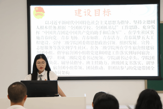 会议第二阶段,钟佳美同学向与会代表解读本学期主要开展的青春向党工程与青春如歌工程,鼓励我院的学生以宿舍为单位积极组建宿舍团小组,形成二级院党委书记统领,学院副书记牵头,学院团委书记负责,辅导员指导,班主任助力,班级团支书落实,训导师督促,宿舍团小组带领,团员推动,非团员参与的党建带团建全覆盖、全动员架构。