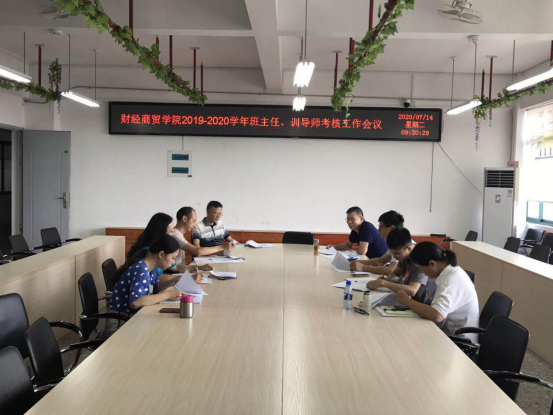2020年7月14日上午,财经商贸学院在实训楼八楼商务谈判室召开2019-2020学年班主任、训导师年度考核工作会议。财经商贸学院学生工作领导小组成员参加了本次会议。