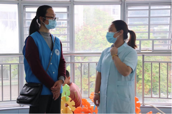 (钟丽珍老师向福利院工作人员了解小朋友们日常生活)