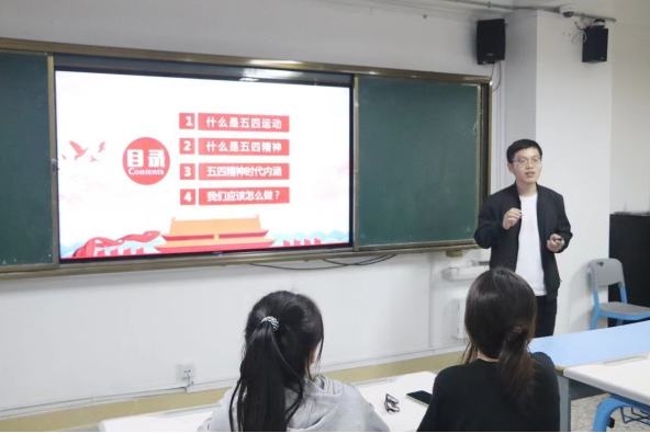 团委副书记卢沂老师从什么是五四运动、什么是五四精神、五四精神的时代内涵、以及我们应该怎么做,四个方面带大家深入学习。在场的同学们认真听讲,深刻体会到这是一次反帝反封建的政治、思想、文化运动,并以爱国、进步、民主、科学四词唤起了越来越多的有志青年。然后通过习近平总书记的《论党的青年工作》引出五四精神的时代内涵:广大青年要努力奋斗,实现中华民族伟大复兴的中国梦;自觉践行社会主义核心价值观,从身边做起,从小事做起,并要自觉奉献青春,保持初生牛犊不怕虎的劲头。最后告诉我们,作为新时代青年,要时刻牢记习近平总书记的教诲,努力学习科学文化知识,争做祖国建设的全新力量,让青春为祖国绽放。