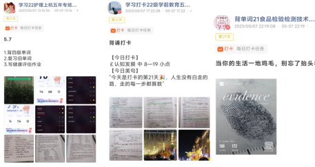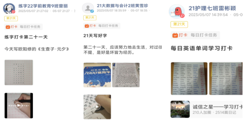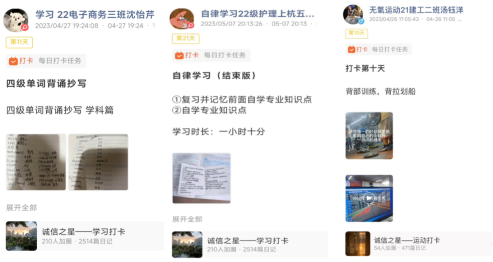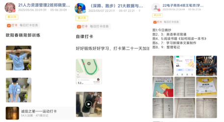 同学们从运动和学习两大类中任选一项进行打卡,如“每日背单词、坚持运动”等,大家每日在小程序里展示出了同学们各式各样的运动和学习的视频照片、心得和方法,互相监督、互相鼓励,既增强了大家的主动性和积极性,也体现出大家热爱生活、健康向上、积极进取的的精神风貌和青春的活力。