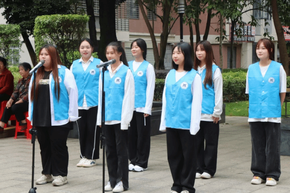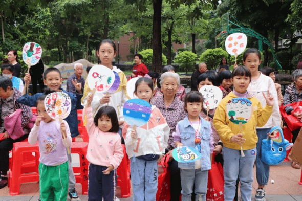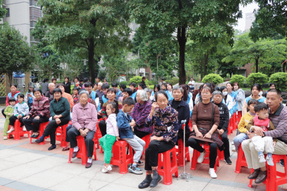 活动中期,志愿者们于10月22日早上八点半在西大门集合清点人数,按照活动开展前期分配好的小组有序的排队,由活动负责人传达活动注意事项,随后前往月山小区开展本次志愿服务活动。到达小区后,各小组各司其职,纷纷开始行动。送贺卡组的志愿者们分别在小区的活动区域,为居民送上我们用心手写的重阳节贺卡,并送上祝福。布置现场组听从现场指导人员的安排,相互配合,一起搬桌子、摆椅子,同时邀请路过的居民一同观看表演。待一切准备就绪后,表演组分别为现场的观众们送上两首歌曲,大家欢声笑语,享受此时此刻的美好氛围。表演结束后,由主持人组织现场的观众与我们一起玩小游戏,并送上小礼品。最后,志愿者们与社区的居民们一起进行制作团扇diy活动,老人与小孩一起参与进来,营造了和谐温馨的画面。