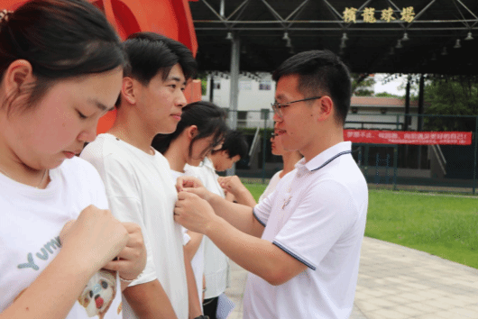 (老师为新团员佩戴团徽)