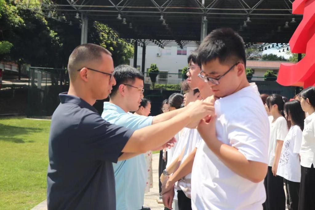 (老师为新团员佩戴团徽)