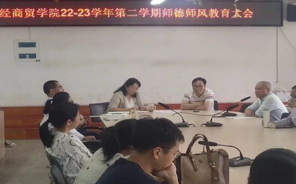 为加强教师队伍建设,提高教师自身修养,弘扬新风正气,增强教书育人,以身立教的社会责任感和使命感,财经商贸学院于2023年5月9日下午在万源楼召开"师德师风教育大会",会议由院党委书记李宝生主持,全院教职员工参加了大会。