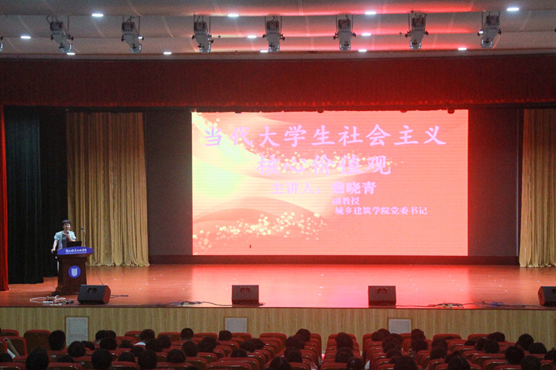 2019年9月26日晚上七点,在学校大匠堂为2019级全体新生举行《社会主义核心价值观》专题讲座,主讲人为城乡建筑学院党委书记詹晓青副教授。