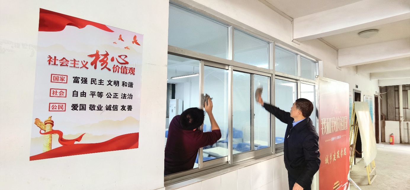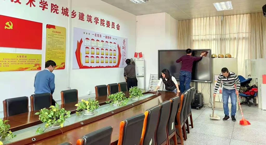 在“城建红墙”前,院党委负责人向大家传达了学校文明办的通知精神,强调要确保活动安全和效果,要求党员、入党积极分子起带头作用,全体师生积极参与。接着,教职工分成几个小组,分别对实训室、多媒体教室、集料区、会议室等公共区域进行了卫生大扫除。之后,大家分头做好办公室、教研室、工作室的清洁。