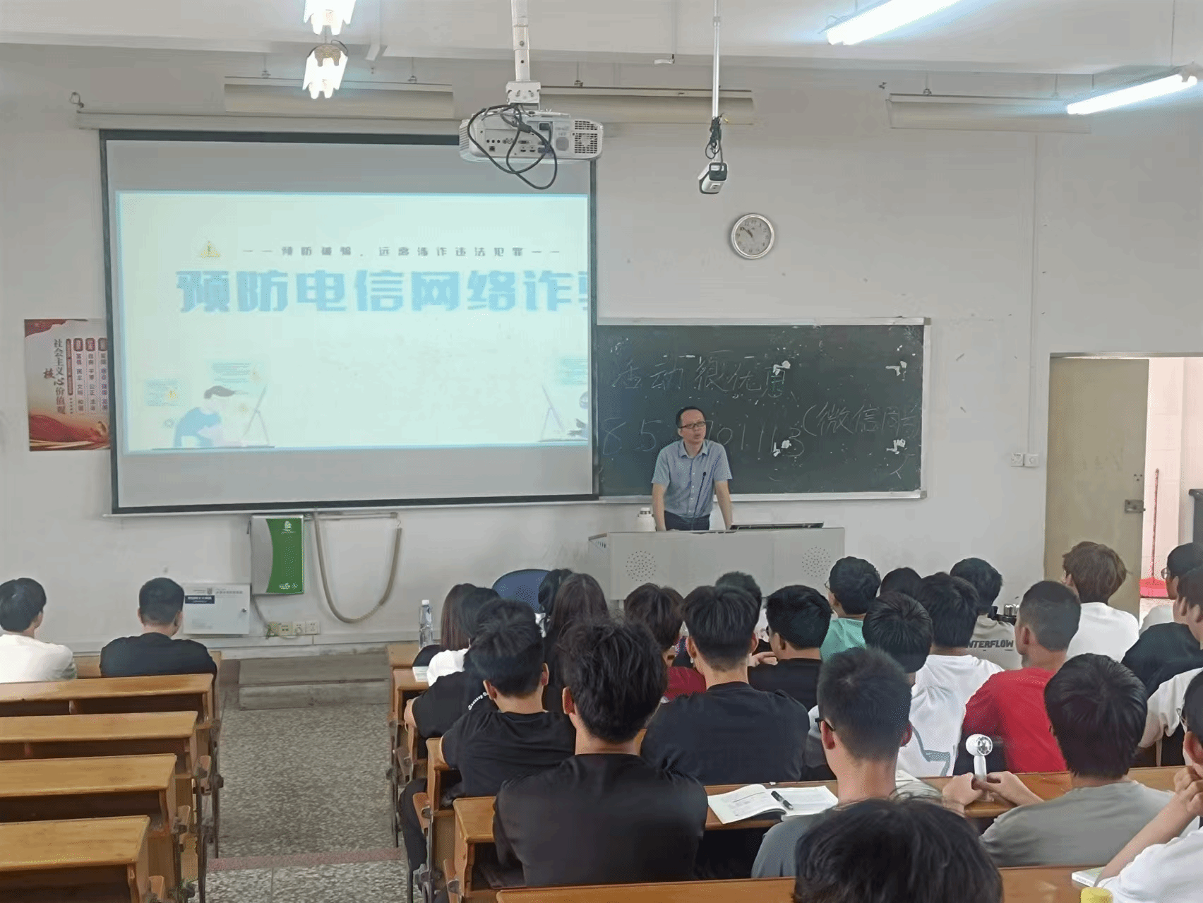 在辅导员的组织下,通过主题班会的形式向同学们介绍电信诈骗的定义、常见套路、电信诈骗预防、涉诈法律法规等知识,通过案例分析,教育引导学生遇事要冷静、不要贪图眼前小利,提醒学生不要点击与个人信息相关的不明链接,不得随意租借个人“两卡”、管好自己的“两卡”。