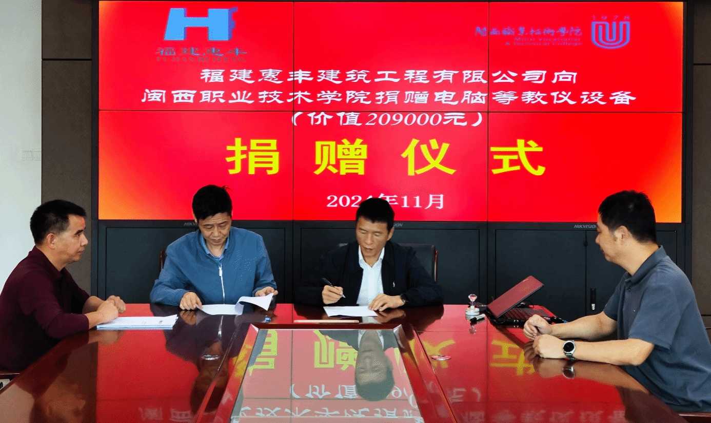 福建惠丰建筑工程有限公司牢固树立质量意识、品牌意识、创新意识,以加快企业发展,做好、做大、做强为目标,现为施工总承包房屋建筑工程一级、施工总承包市政公用工程一级等资质,荣获“福建省质量守信单位”、龙岩市“重合同、守信用”先进单位等一系列荣誉称号。作为校企合作企业,长期以来,该公司关心支持MG冰球突破官网事业发展,在推进龙岩市建筑行业校企合作指导委员会工作、城乡建筑学院“双师型”教师培训培养、学生岗位实践等方面开展大量的卓有成效的工作。此次该公司向MG冰球突破官网捐赠电脑、打印机等教仪设备总值209000元,将有力推进城乡建筑学院特长生工作室建设、进一步改善教学条件。