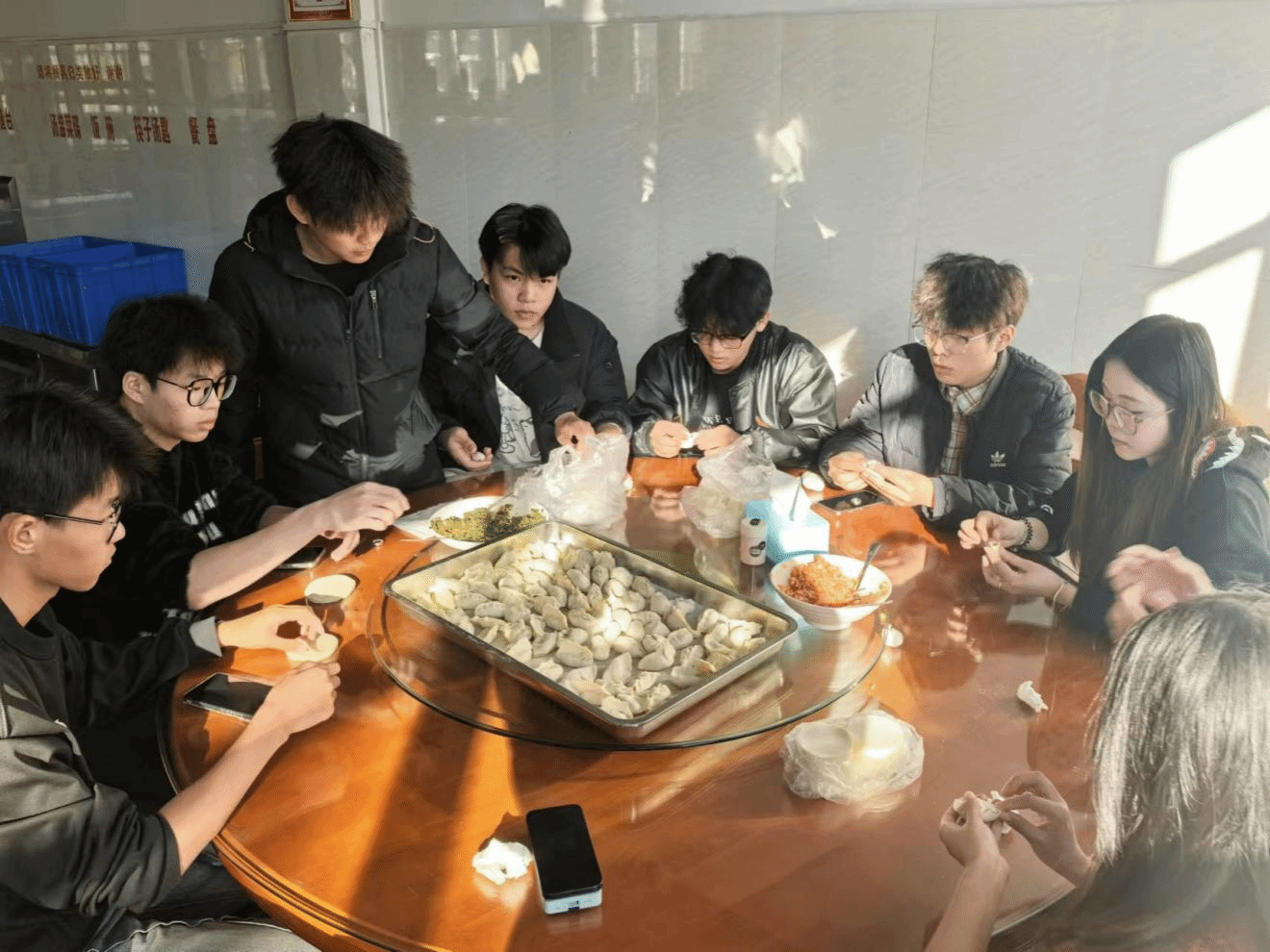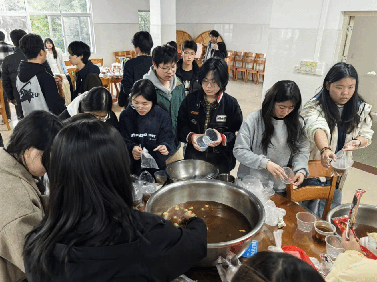 在教工食堂,师生们其乐融融,齐心协力,数百个饱含心意的饺子新鲜出炉。随后,志愿者们将热气腾腾的饺子、汤圆打包,怀着感恩之心分别送往保安叔叔、老师还有同学的手中。通过活动,不仅让同学们传承文化习俗,还在寒冬岁末以实际行动传递关爱与情谊。