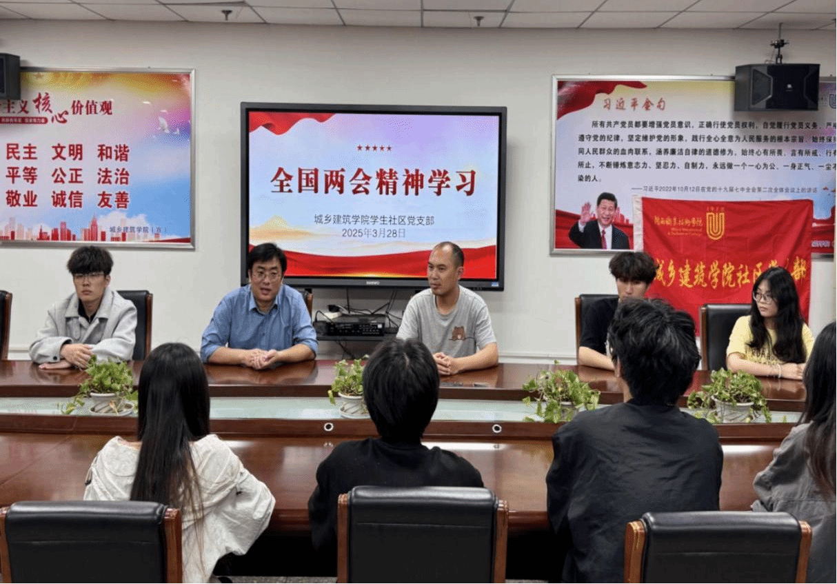为深入学习习近平总书记在全国两会期间的重要讲话精神和全国两会精神,城乡建筑学院学生社区党支部于3月28日召开了“全国两会精神学习”主题座谈会,党委副书记何煊强老师、团委书记邱志国老师和2023级两委主席团成员参加。通过交流学习,同学们纷纷表示更深刻理解了中国式现代化对教育、科技和人才的需求。