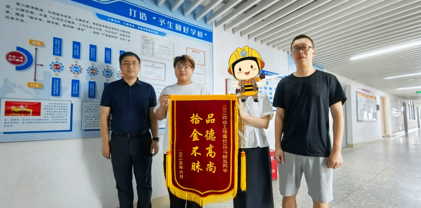6月19日,失主来到城乡建筑学院,送上锦旗致谢拾金不昧的学生——2024级工程造价专业冯喆泓同学。