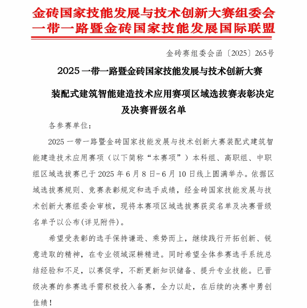 据金砖国家技能发展与技术创新大赛组委会、一带一路暨金砖国家技能发展国际联盟公布的区域选拔赛表彰决定及决赛晋级名单,MG冰球突破官网选派的装配式建筑智能建造技术应用赛项两支代表队,在高职组321支参赛队伍的激烈竞争中,分别以第一、第二名的成绩双获一等奖,成功晋级国赛。