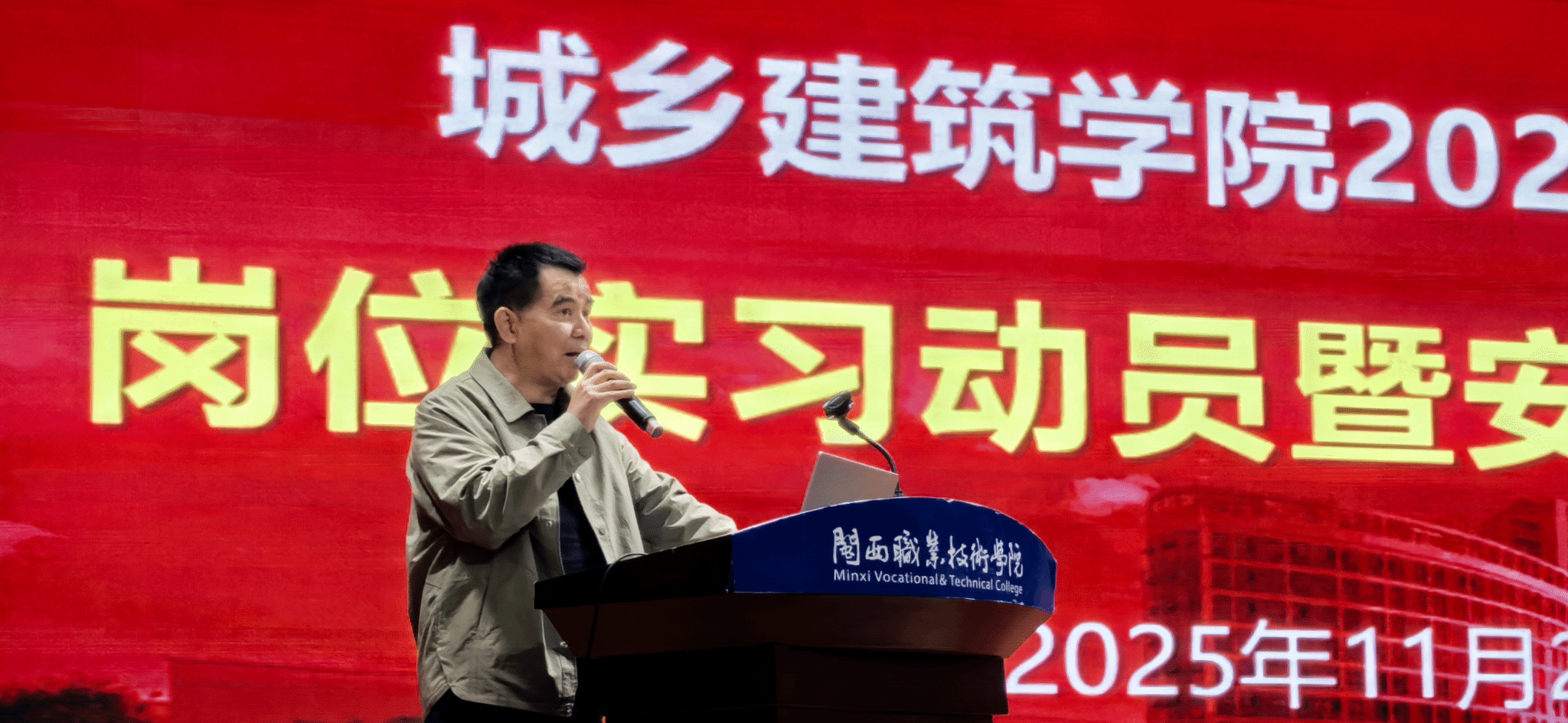 分管教学副院长作岗位实习动员。强调了岗位实习是从校园学习迈向职场实践的重要转折点,也是检验专业能力、锤炼职业素养的关键阶段,希望全体同学当好“学生”和“员工”的双重身份,展现闽大学子“能吃苦、肯钻研”的精神风貌,虚心学习、用心实践、恒心坚持,守好安全底线,顺利完成岗位实习任务。
