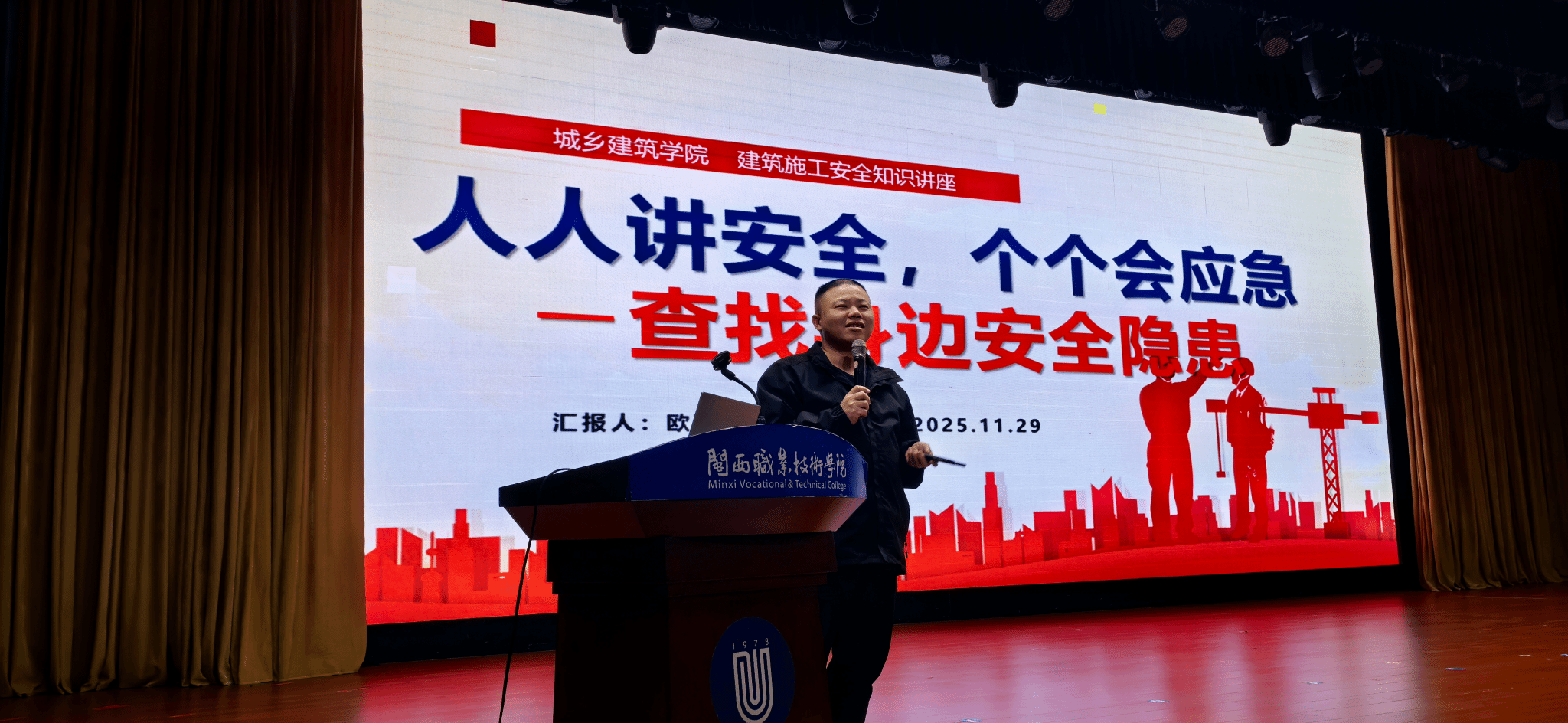 福建大华鑫公司副总经理、校友欧劲羽结合自身经历,围绕“人人讲安全、个个会应急——查找身边的安全隐患”2026年安全生产月主题,通过形势分析、案例讲解、政策解读、视频分享、有奖问答等形式,开展建筑施工安全知识讲座。