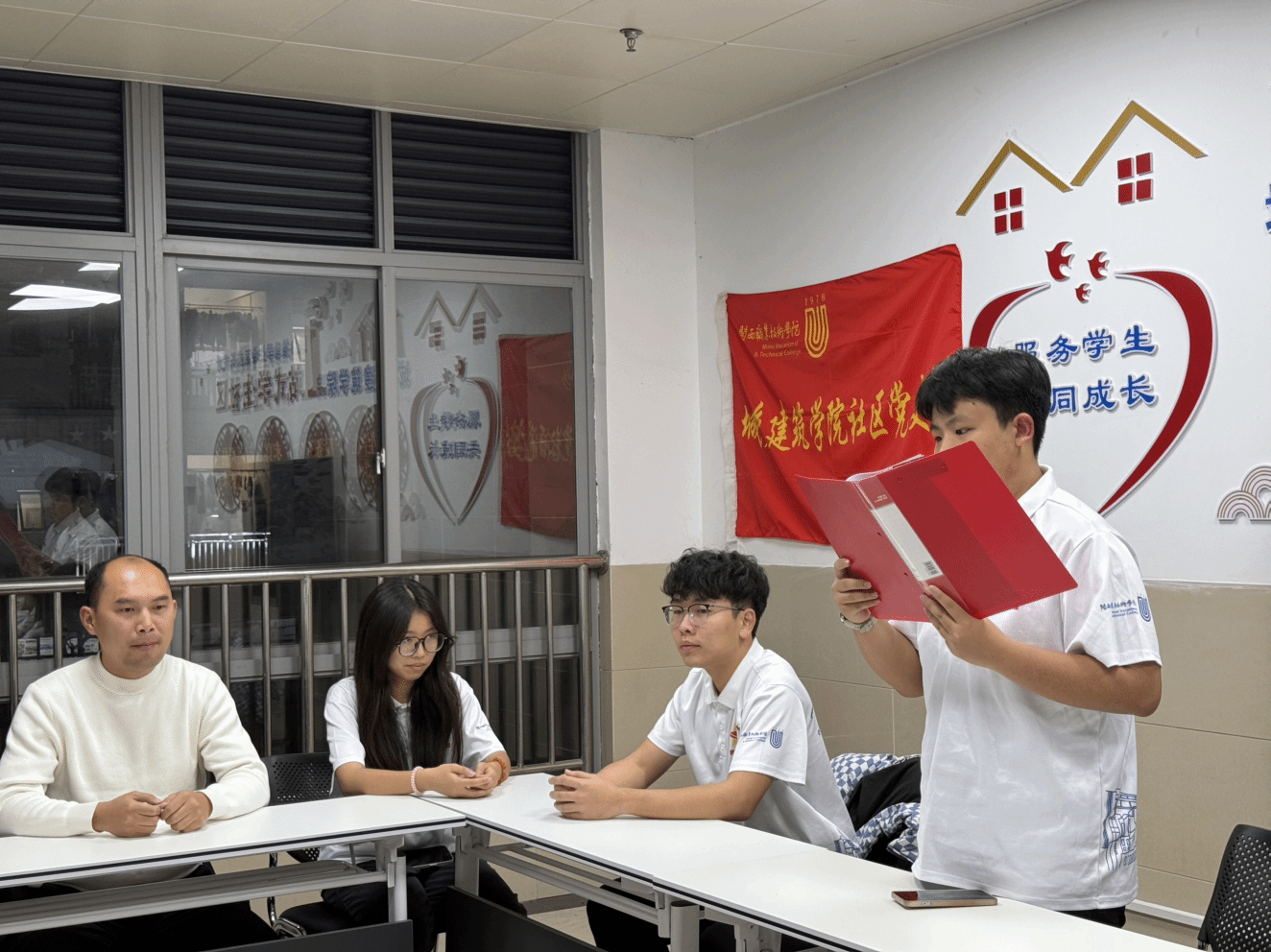 活动开场,团委书记邱志国老师围绕“青年如何锚定中国式现代化目标、在专业领域践行担当”作引导发言,点明建筑类专业青年可在城乡建设、绿色建筑等领域发挥专长。青马学员刘鑫城同学结合专业分享:“作为城乡建筑专业学生,我们的使命是把课堂里的设计知识转化为乡村振兴的实际方案,比如参与老旧小区改造、乡村风貌提升,这就是我们践行现代化建设的具体路径。”学员谢冰冰同学则提到:“要从‘技能学习者’转向‘行业建设者’,在实训中打磨技术,让每一份设计都贴合绿色建筑、智慧城乡的发展方向。”