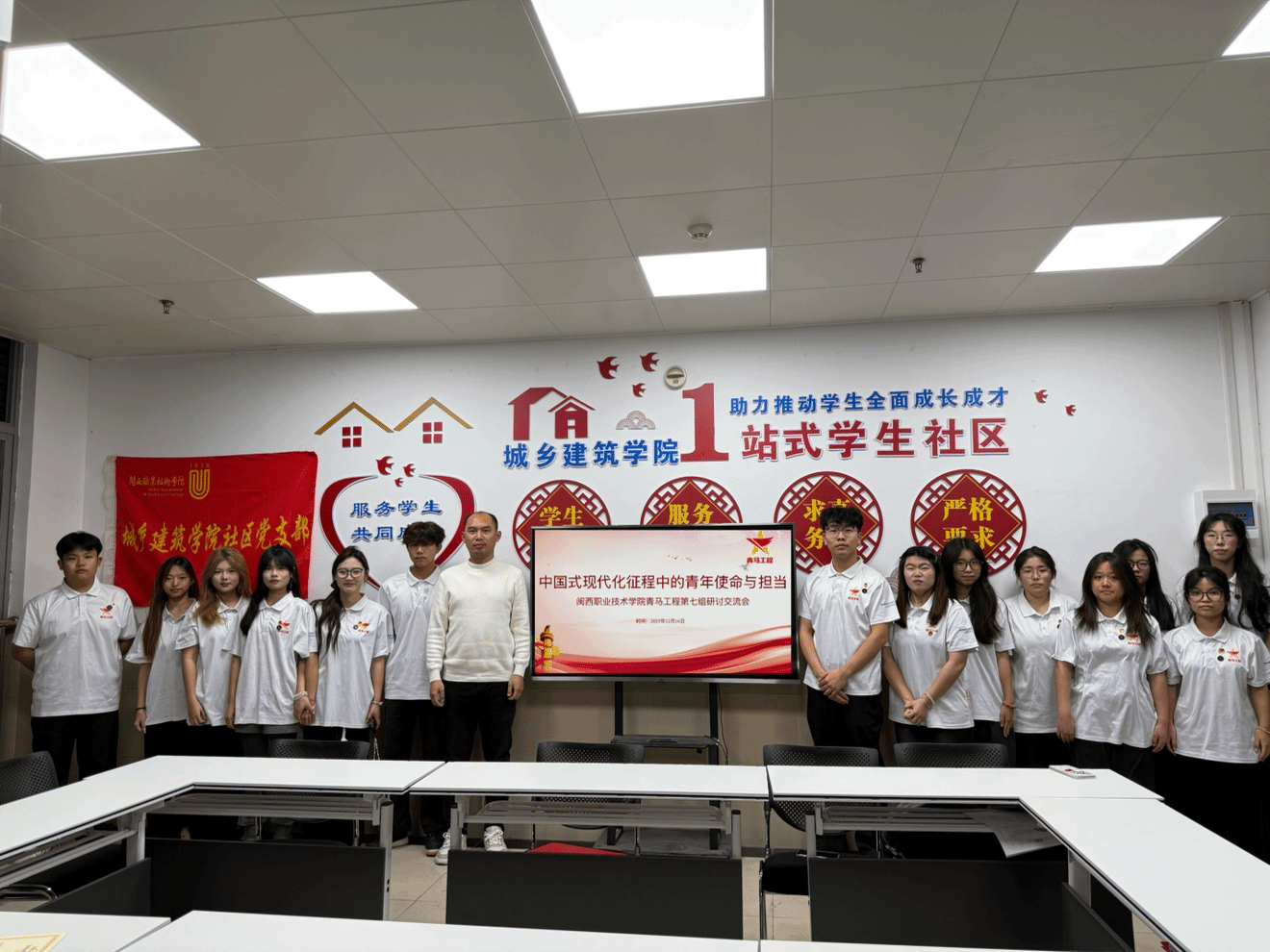 12月16日,城乡建筑学院社区党支部组织青马工程第七组学员,在一站式学生社区活动室开展“中国式现代化征程中的青年使命与担当”研讨交流会。