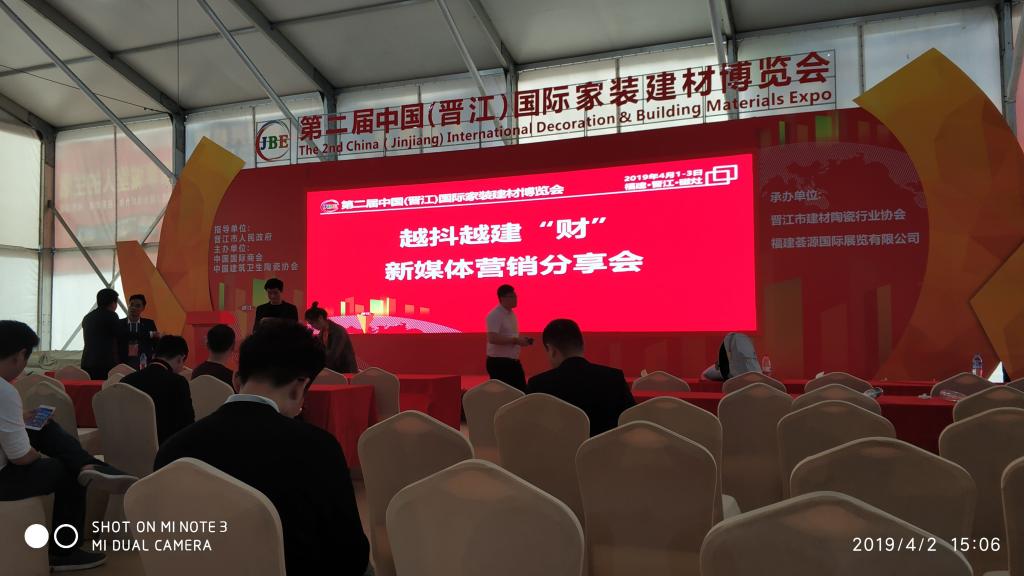 为使学生见识到更多关于专业方面以后会接触到的材料,2019年04月02在专业老师的带领下装饰班全体应邀参加了晋江家博会。下午一点半,同学们聚集在海西建材城主展馆讨论区聆听了由字节跳动有限公司合作举办的越抖越建“财”新媒体营销分享会。字节跳动有限公司的高级讲师为我们讲述了在当代社会如何利用“抖音”、“火山小视频”、“西瓜视频”等手机软件,通过拍摄短视频来达到营销效果。在分享会开始之前,学生分组自行参观了主展区中每家企业展示的产品。