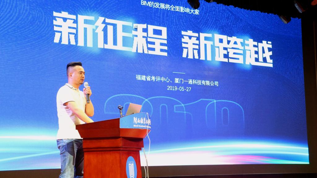 授牌结束,厦门一通科技有限公司总经理林标锋为我院师生作题为“新征程,新跨越”的BIM知识讲座。通过讲座让学生对BIM技术在建筑工程领域的发展和影响有了更深的了解,不仅开拓了我院师生的信息化思路,锻炼了我院学生的思维,为BIM技术人才的培养和学生将来的就业提供了新方向。