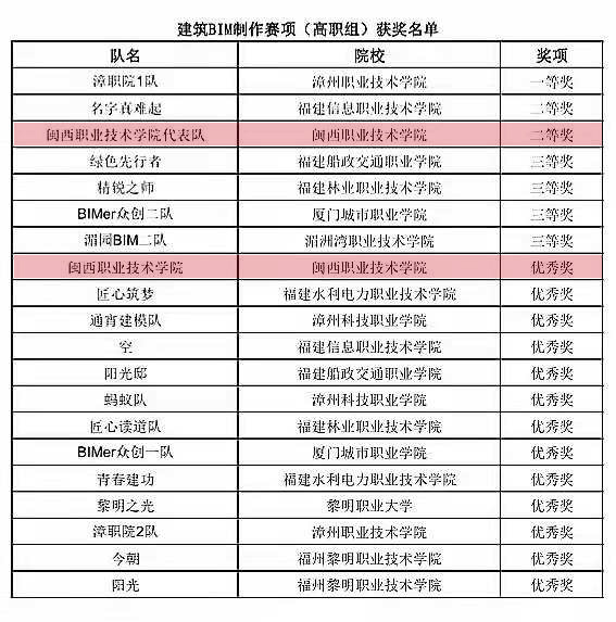 11月27日,第七届海峡两岸大学生职业技能竞赛闭幕,城乡建筑学院学生(指导老师:何煊强、王秋丽)在建筑BIM制作(高职组)赛项中分别以总分第三、第八名的成绩获得二等奖、优秀奖。