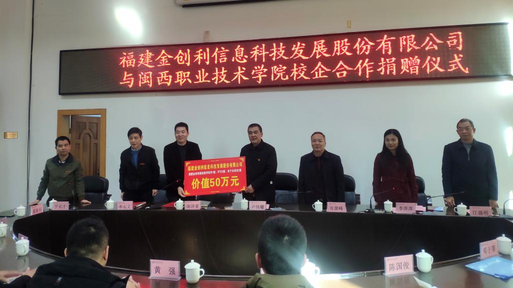 此次捐赠,由福建金创利信息科技发展股份有限公司向城乡建筑学院捐赠测绘教学平台一套、徕斯达RTK两台、欧波电子水准仪两台,总价约50万元。捐赠仪式上,卢伟耀充分肯定了校企双方近年来的合作成果,对企业做出的贡献表达了真挚的感谢,希望以此为契机推动校企双方在技能竞赛、师资培训、人才培养等方面深度合作、共建双赢。陈济爱高度评价了学校近年来的办学成就,特别是技能竞赛取得的优异成绩,希望通过校企合作,进一步发挥企业作用,提升城乡建筑学院的教育教学水平和人才培养的质量。校企双方代表签订了捐赠协议书,就职业教育“1+X”证书制度的实施和以赛促教、以赛促学等方面进行研讨,达成了一致意见。