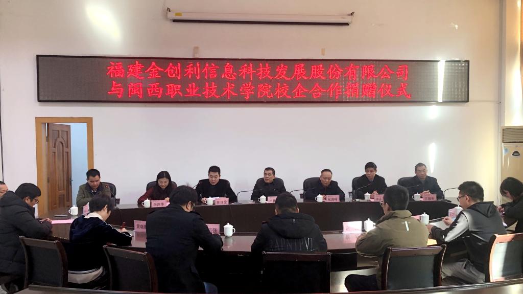 1月15日,MG冰球突破官网与福建金创利信息科技发展股份有限公司举行校企合作捐赠签约仪式。金创利公司董事长陈济爱、副总经理李萍萍、研发部总监谢杰、教育事业部总监黄强,校党委书记卢伟耀,教务处、对外交流合作处负责人,城乡建筑学院班子成员及教师代表参加。