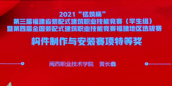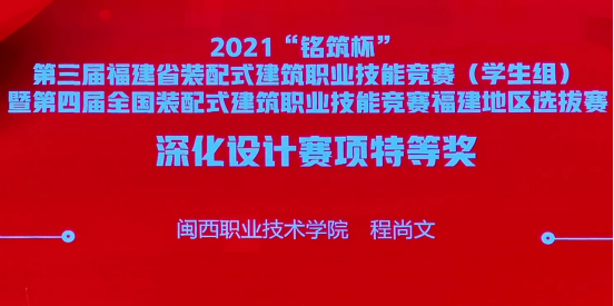 2021年“铭筑杯”第三届福建省装配式建筑职业技能竞赛(学生组)由福建省建筑产业现代化协会、福建省建筑行业职业教育指导委员会主办,来自全省本、专科院校共45支代表队参加。竞赛分装配式构件深化设计、装配式构件制作与安装两个赛项,分别以技能应用、岗位模拟方式进行比赛,共设特等奖两项、一等奖四项和二等奖八项