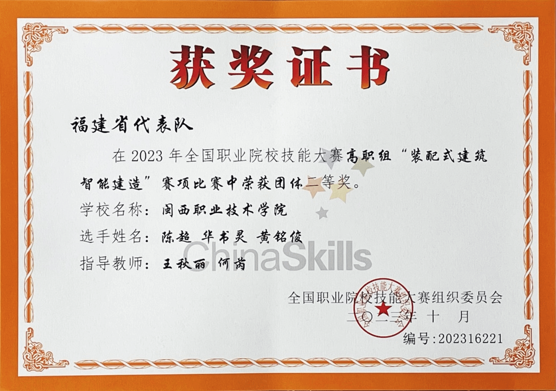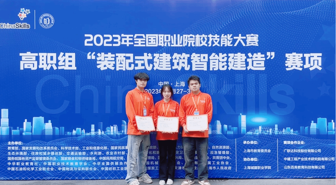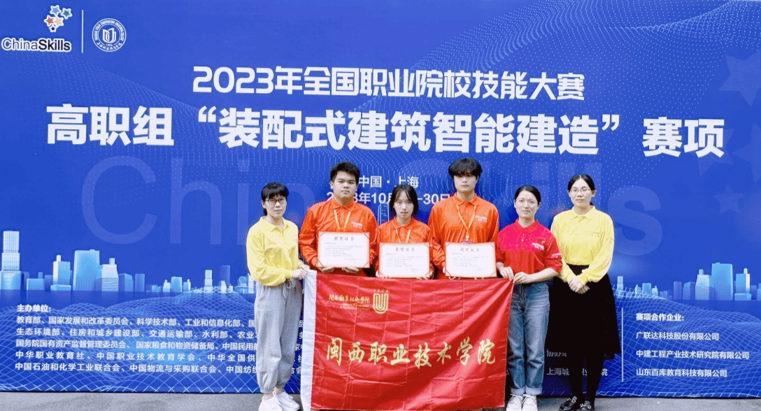 10月27-30日,2023年全国职业院校技能大赛高职组“装配式建筑智能建造”赛项在上海举办。MG冰球城乡建筑学院师生组队(参赛选手:陈超、黄铭俊、华书灵,指导老师:王秋丽、何芮)代表福建省参赛,荣获该赛项团体二等奖。