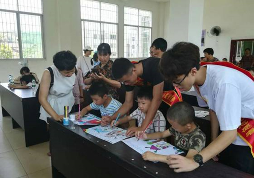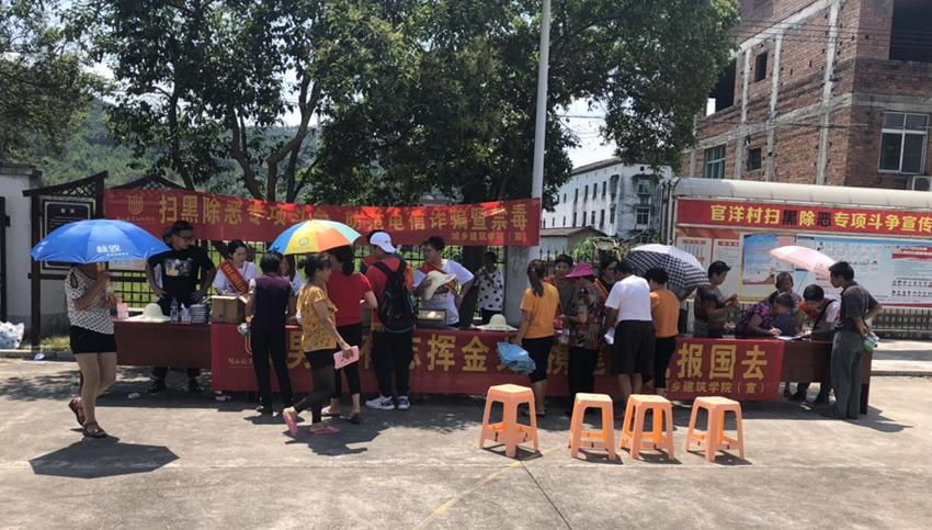 宣誓后社会实践对分组在白沙镇进行了关于扫黑、防电信诈骗、禁毒和征兵的入户宣传,向当地群众讲解了“扫黑除恶专项斗争 防范电信诈骗暨禁毒”的重要意义。宣传活动结束后,“三下乡”社会实践队前往官洋村,在官洋村,将白沙镇团委指导思想、政策协助村领导传达给村民。师生分成四组,进行有序的分工,通过走访,深入了解当地村民生活状况、需求和风俗文化等。第一组分队到贫困户家庭走访慰问活动,给贫困户和老人送去了水果、油盐等,并与贫困户谈心,给他们送关爱和温暖;官洋村个别路段偏窄影响周边发展,需要道路拓宽。由我院测量协会学生代表组建第二组分队进行实地测量。通过实地测量将学生课堂上的理论知识应用到实际中来,更提高了学生自身的技能;为丰富中小学生暑期生活,第三组分队走进官洋村村委会,通过建筑实物模型让村里的中小学生丰富了建筑知识,并举行了“美丽乡村入画来 儿童齐绘官洋美”中小学绘图比赛,与当地小朋友们进行了亲密的互动,并鼓励他们要好好学习,优秀成才。第四组分队在村里开展了问卷调查,通过调查了解到当地村民幸福指数,并留意到当地村民非常重视子女的成才教育和生活品质改善等。