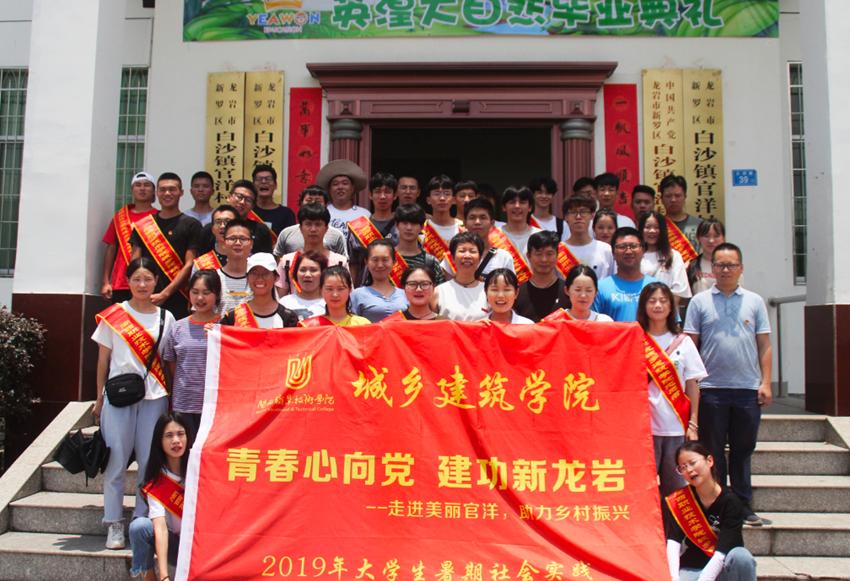 2019年6月30日,由龙岩市新罗区白沙镇团委与城乡建筑学院联合开展暑期“三下乡”大学生社会实践活动在龙岩市新罗区白沙镇、官洋村举行。城乡建筑学院党委书记詹晓青、团委书记陈春福及章宇萍、詹闽研、陈国栋、钟明文等老师带领城乡建筑学院团委学生代表参加了此次暑期“三下乡”社会实践活动。
