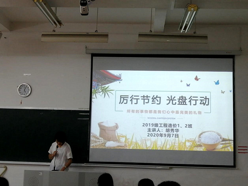 为深入贯彻落实习近平总书记对制止餐饮浪费行为所作出的重要指示精神,城建学院18级19级各班级召开“厉行节约制止餐饮浪费”主题教育班会,班会主要传达了习近平总书记对制止餐饮浪费行为所作出的重要指示精神,让学生对“勤俭节约、艰苦奋斗”的理念有了更深刻的理解。通过展示校园存在的餐饮浪费行为,学生之间进行检讨和自我检讨,达到“红脸出汗”的效果,形成相互监督的氛围,从自身做起、从点滴做起,争做健康餐饮、文明生活的倡导者。通过主题班会活动,增强学生“勤俭节约”的意识,树立“节约光荣、浪费可耻”的观念,引导养成“节俭节约”的良好行为习惯。
