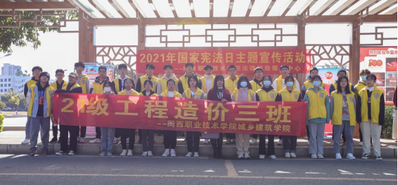 12月4日,城乡建筑学院工程造价专业2021级(3)班全体同学在班主任罗芳香老师的带领下,在校园里开展国家宪法日主题宣传活动,并深入社区、街道,普及宪法知识,弘扬宪法精神,增强广大师生和人民群众的法治观念,营造全民知宪、遵宪、守宪的良好法治氛围。