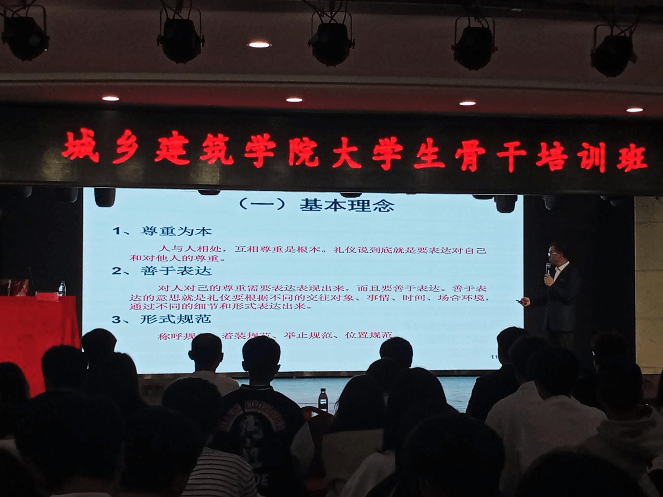 文旅与旅游学院党委书记陈荣坤以“大学生社交礼仪”为题,从社交礼仪在大学生人际交往中的重要性导入,教导同学们做一个懂礼貌、讲礼仪、能宽容、懂尊重的人。他强调,社交礼是一种无声的人际交往语言,不仅能体现一个人的修养、涵养、教养和素质水平,有利于我们的身心健康,而且是我们个人发展、事业进步的需要,同时也是社会时代的需要,是一门必修课,每个人都应该学习社交礼议。