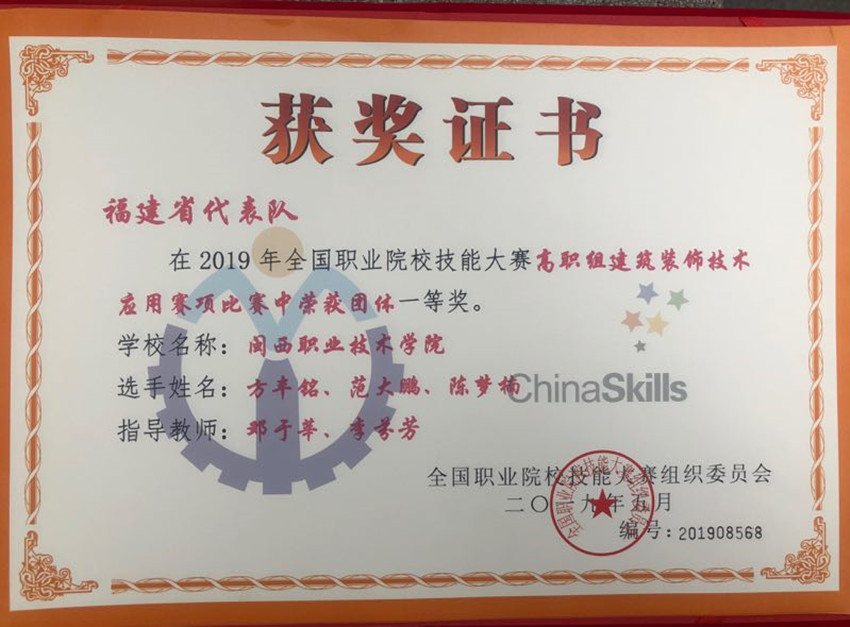 今年寒假,李芬芳接手“建筑装饰技术应用”这个赛项,与同事邓于莘一起对学生进行培训。她一有时间就和学生一起在特长生工作室研究比赛题目,早出晚归,不计较个人得失,潜心钻研赛题。4月16日,他们去漳州参加“建筑装饰技术应用”福建省职业院校技能大赛,荣获全省第一名!6月1日,本该陪孩子过儿童节的,可她们却带领学生去杭州参加“建筑装饰技术应用”全国职业院校技能大赛。一分耕耘一分收获,她们的辛劳付出最终换来了全国第二名的好成绩!