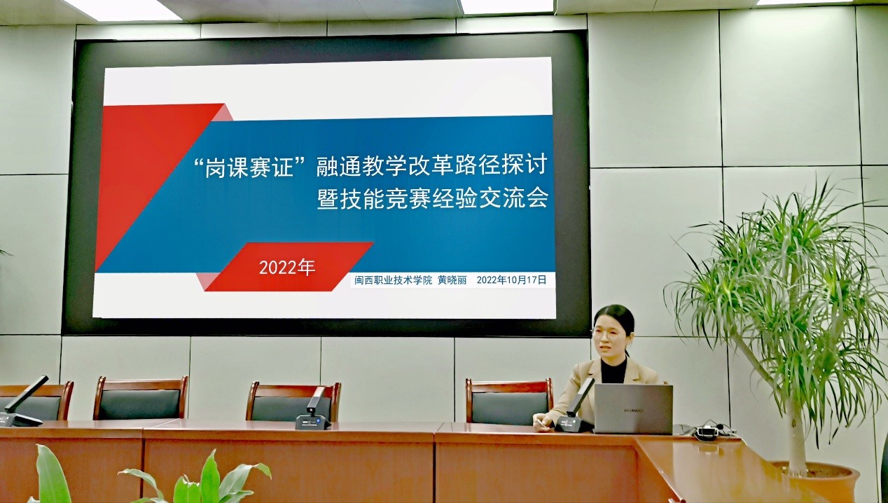黄晓丽老师从“岗课赛证”融通教学改革路径入手,就如何结合课堂教学、实践教学、职业技能等级证书、技能竞赛等多维度提升职业教育的人才培养质量、提升学生技术技能水平进行讲解,结合多年来指导学生参加省赛、国赛实践,分享了心得体会和经验总结。