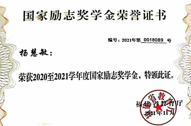 功夫不负有心人。两年来,杨慧敏同学成绩名列前茅,每学期均获专业一等奖学金。2021年5月25日,她光荣地成为一名中共预备党员。在校期间,硕果累累。被学校评为“五好学生”、“优秀共青团员”、“优秀学生干部”等荣誉称号。参加“互联网+创新创业大赛”获团体三等奖、班班辩论赛团体二等奖。两度获得“国家励志奖学金”,被评为2022届“优秀毕业生”。
