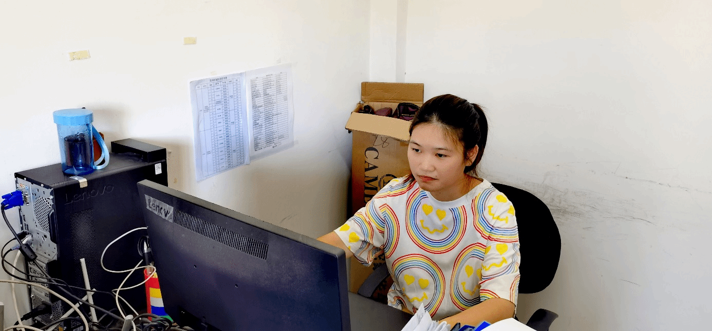 周末,我们在美山采茶灯研习基地开展学生素质拓展活动,得知杨慧敏同学在岗,便来到新罗区苏坂镇乡村振兴和企业发展服务中心办公室,看见杨慧敏同学坐在电脑前,认真地核对数据。当我们靠近时,她猛一抬头,显然有些惊讶,瞬间又激动了:“老师,你们怎么在这里?为什么没提前跟我说?”