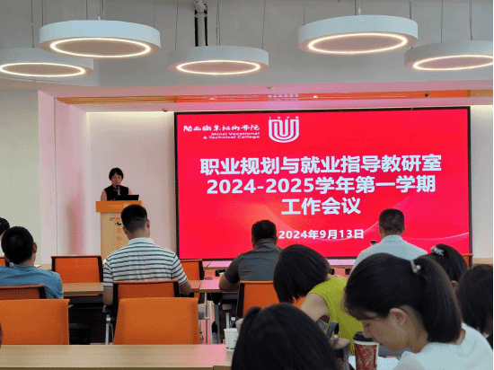 2024年9月13日下午,创新创业学院在万源楼三楼龙标大学生双创孵化基地路演厅,召开了职业生涯规划与就业指导教研室2024-2025学年第一学期工作会议,职业规划与就业指导教研室全体成员参加。