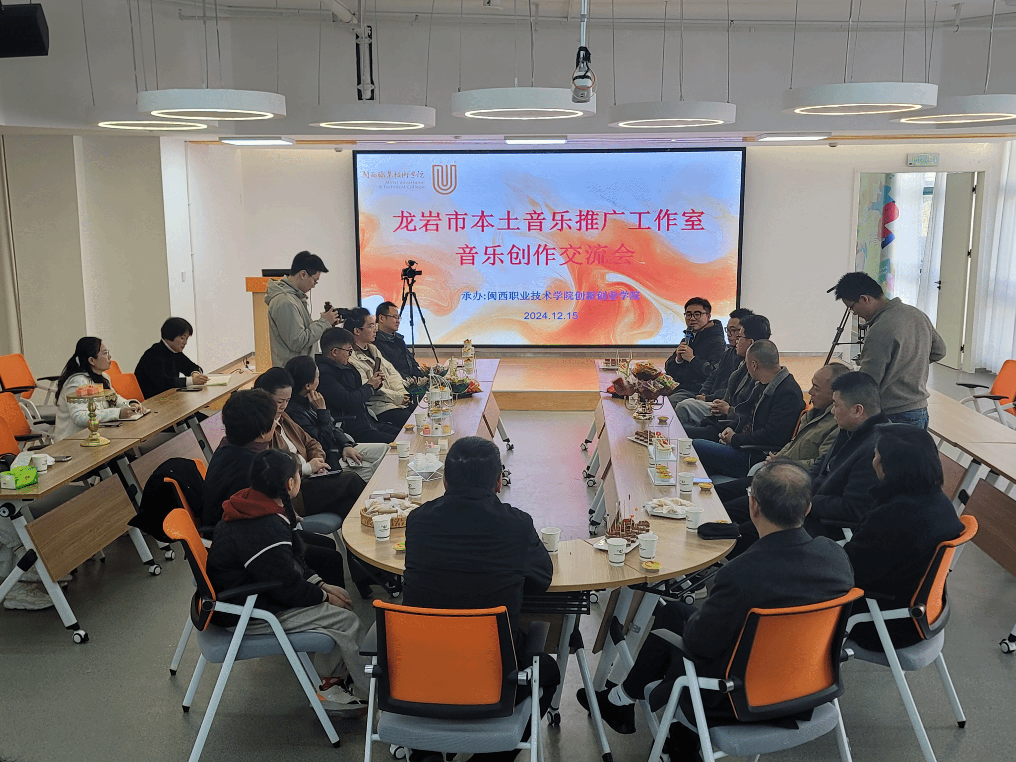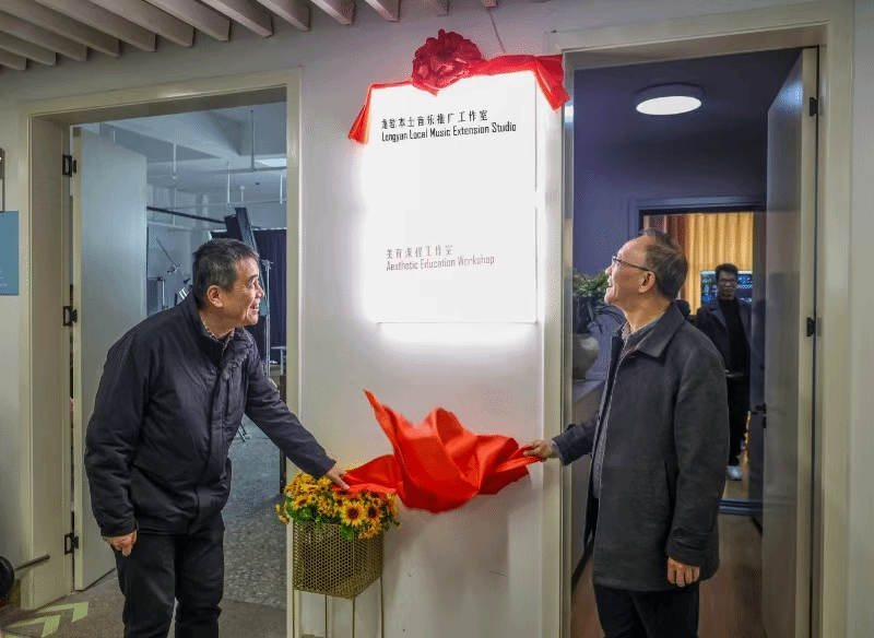 12月15日,龙岩本土音乐推广工作室暨美育课程工作室在龙标大学生双创孵化基地正式揭牌成立!学校党委卢伟耀书记、龙岩市人大常委会秘书长张亮春共同为工作室揭牌,原龙岩市人大常委会主任饶作勋同志出席了揭牌仪式。龙岩市汉剧传习中心、山歌传习中心、龙岩艺术学校嘉宾,龙岩市融媒体中心、新罗区融媒体中心及“猪团逛龙岩”等媒体齐聚万源楼三楼龙标双创孵化基地,见证这一喜庆的时刻。嘉宾们在工作室感受了7.1.4全景声音乐的震撼视听效果,参观了龙标大学生双创孵化基地。